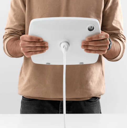 The Bouncepad Lounge is a tethered tablet enclosure designed for easy pick-up & user interaction. The Lounge rests on the surface in landscape mode.