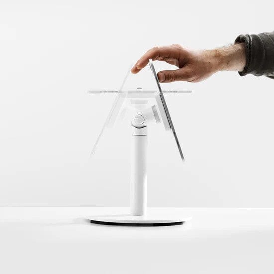 Bouncepad Core Counter Twist is a secure countertop tablet kiosk with a rotating and tilting mount, giving staff and customers a clear, flexible viewing angle at low-level counters while keeping devices neatly cabled and protected from tampering. It solves messy, improvised tablet setups by combining a compact weighted base, lockable head, and hidden cable routing in one professional stand.